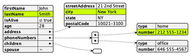 Another example shows how JSON can be rendered. The object in Example 2, “JSON source” renders to the image show in Figure 2, “JSON diagram”. (Note the use of pragmas for highlighting.)